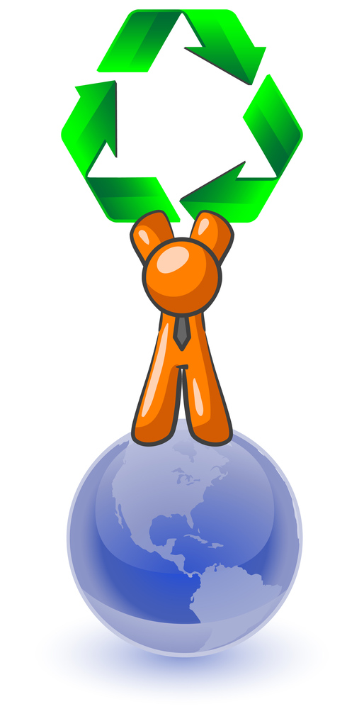 An orange man standing on top of the earth holding a large recycling symbol. Good concept for environmental earth preservation. Keywords: Graphic, Illustration, Bright, Vibrant, Glossy, Shiny, Man, Character, Cute, Element, Simple, Clip Art, abstract, care, circle, clean, concept, conservation, cycle, design, ecology, environment, environmental, garbage, global, green, nature, object, pattern, protection, recycle, recycling, reserve, reuse, save, shape, sign, single, symbol, trace, waste, white, holding, environmentalist, activist, professional, globe, world, earth, conservative, standing, orange