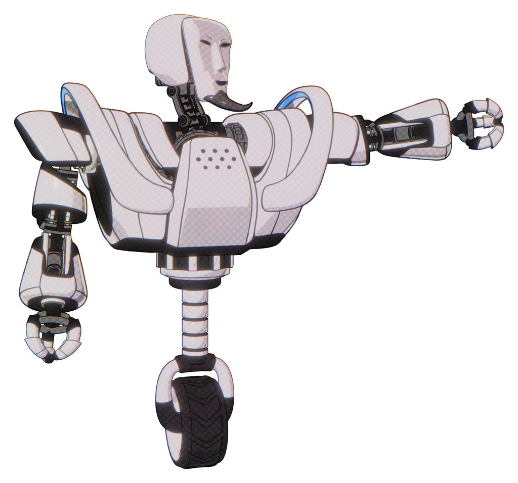 Bot containing humanoid face mask and heavy upper chest and heavy mech chest and battle mech chest and unicycle wheel. White halftone toon. Pointing left or pushing a button..