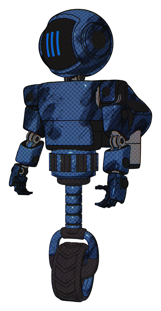 Automaton containing elements: digital display head, three vertical line design, light chest exoshielding, prototype exoplate chest, rocket pack, unicycle wheel. Material: Grunge dark blue.
