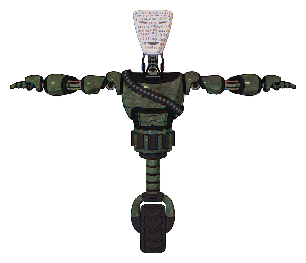 Cyborg containing humanoid face mask and binary war paint and light chest exoshielding and rubber chain sash and unicycle wheel. Old corroded copper. T-pose.