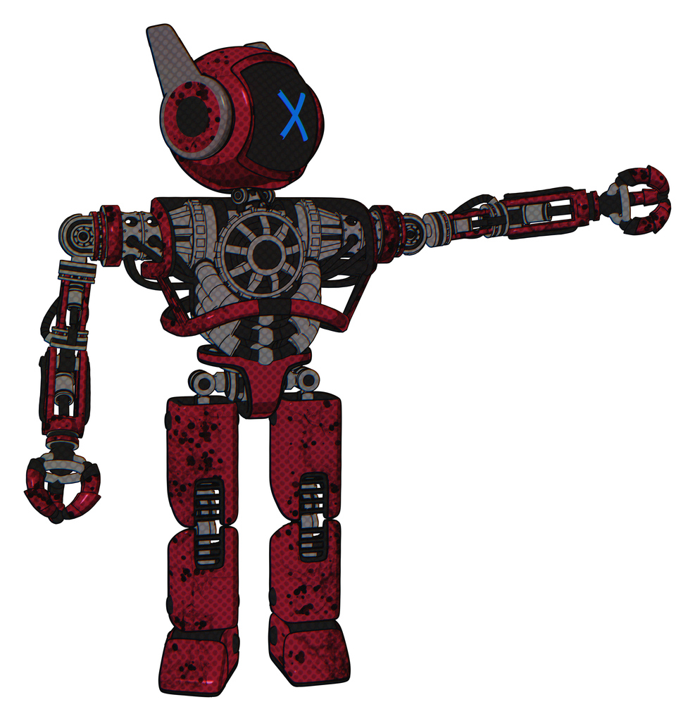 Robot containing digital display head and x face and winglets and heavy upper chest and no chest plating and prototype exoplate legs. Grunge dots royal red. Pointing left or pushing a button..