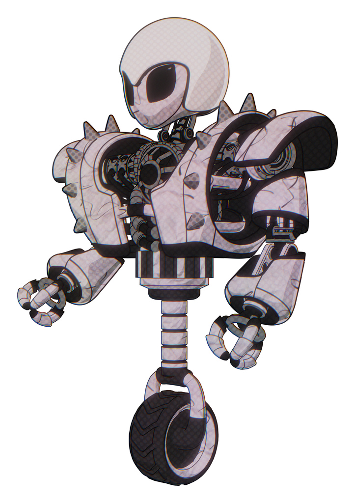 Robot containing grey alien style head and black eyes and helmet and heavy upper chest and heavy mech chest and shoulder spikes and unicycle wheel. Sketch pad doodle lines. Facing right view.