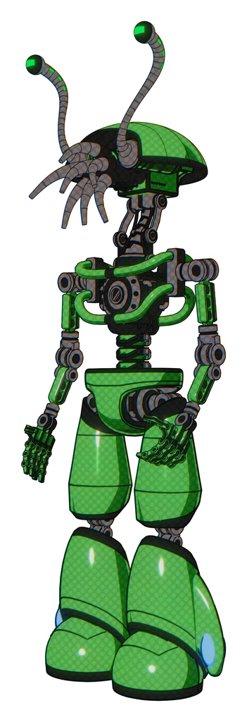 Mech containing dual retro camera head and shrimp head and light chest exoshielding and no chest plating and light leg exoshielding. Secondary green halftone. Facing right view.