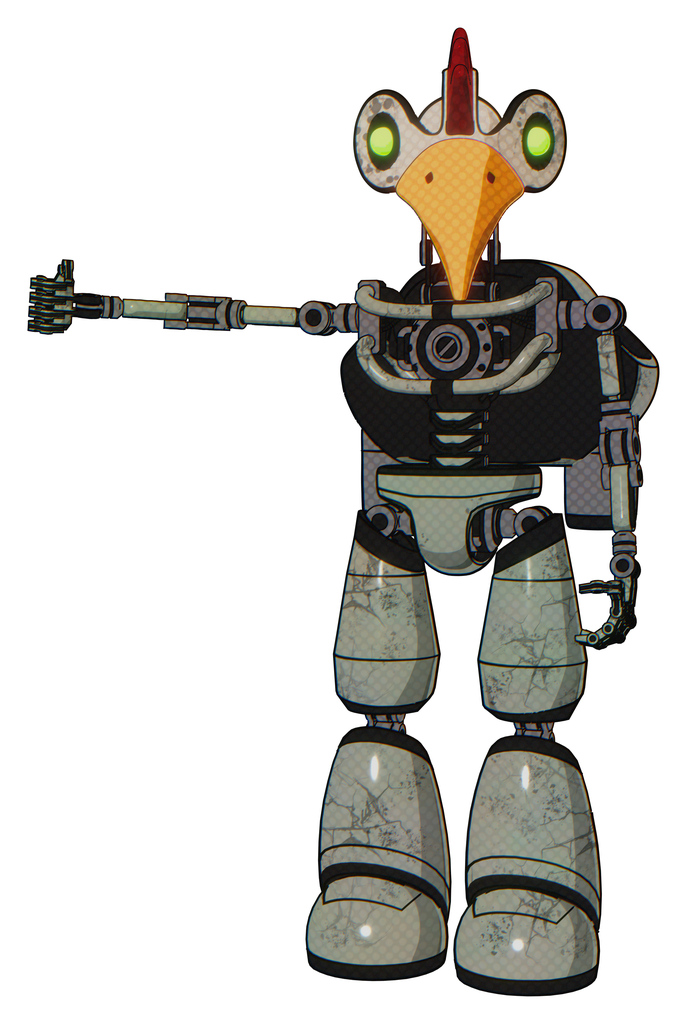 Droid containing bird skull head and green eyes and chicken design and light chest exoshielding and rocket pack and no chest plating and light leg exoshielding. Green metal.