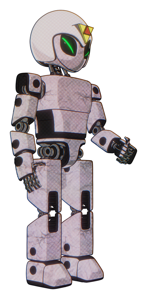 Automaton containing elements: grey alien style head, green demon eyes, triangle design, helmet, light chest exoshielding, prototype exoplate chest, prototype exoplate legs.
