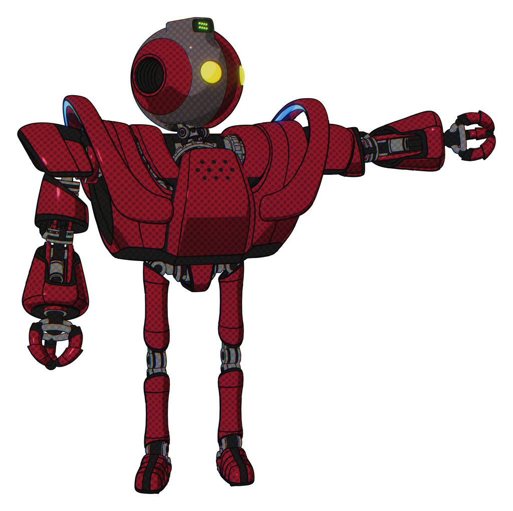 Mech containing oval wide head and yellow eyes and green led ornament and heavy upper chest and heavy mech chest and battle mech chest and ultralight foot exosuit. Fire engine red halftone.