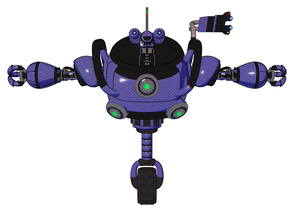 Cyborg containing dual retro camera head and reversed fin head and heavy upper chest and chest green energy cores and unicycle wheel. Primary blue halftone. T-pose.