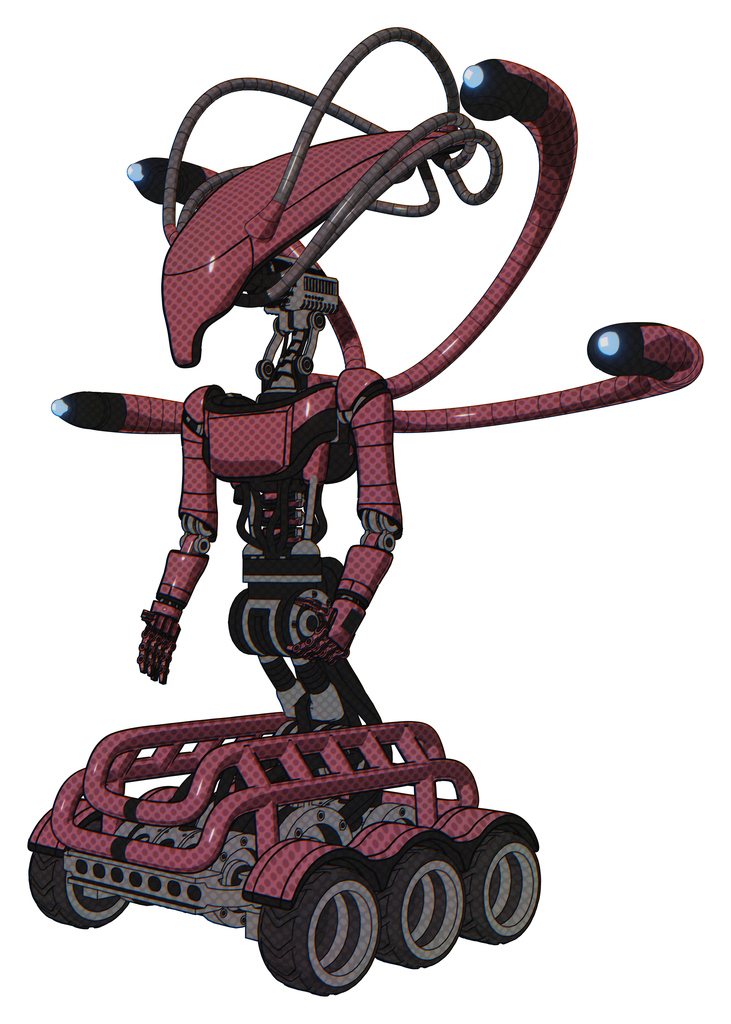 Cyborg containing flat elongated skull head and cables and light chest exoshielding and ultralight chest exosuit and blue-eye cam cable tentacles and six-wheeler base. Muavewood halftone.