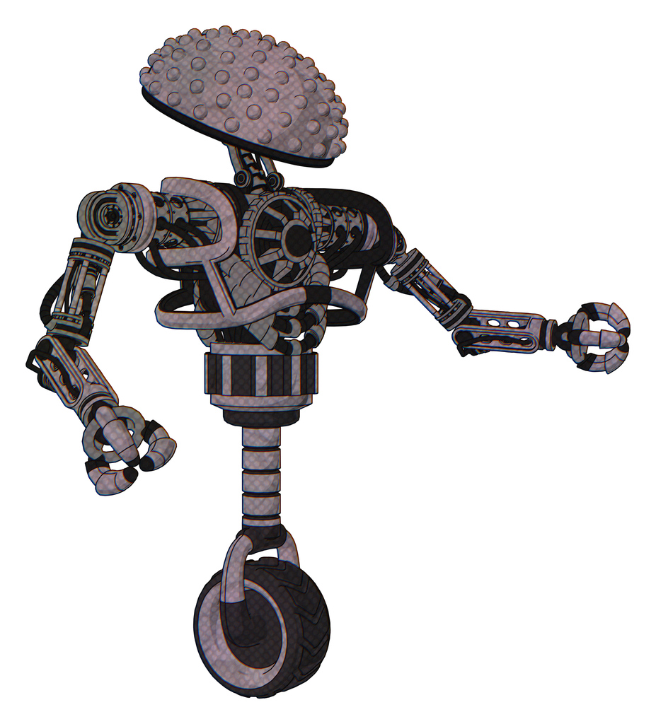 Automaton containing knucklehead design and heavy upper chest and no chest plating and unicycle wheel. Dark sketch. Interacting.