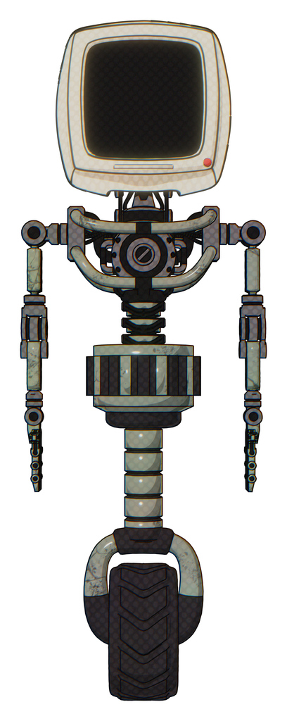 Droid containing old computer monitor and light chest exoshielding and no chest plating and unicycle wheel. Green metal. Front view.