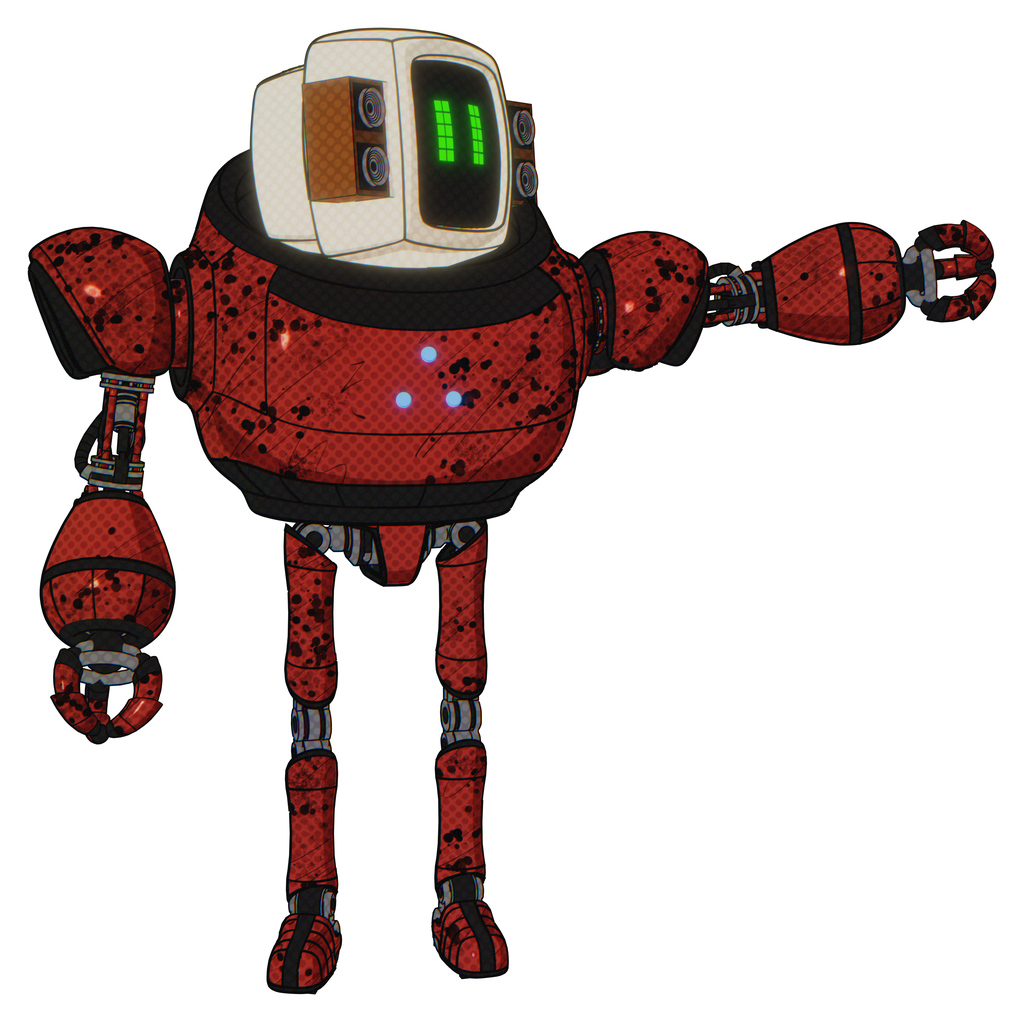 Cyborg containing old computer monitor and pixel line eyes and old retro speakers and heavy upper chest and triangle of blue leds and ultralight foot exosuit. Grunge dots cherry tomato red.
