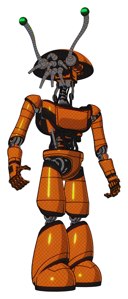 Robot containing dual retro camera head and shrimp head and light chest exoshielding and ultralight chest exosuit and light leg exoshielding. Secondary orange halftone. Hero pose.