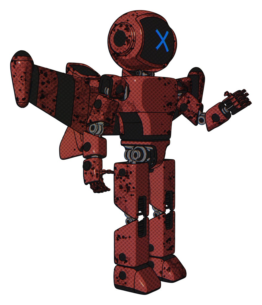Bot containing digital display head and x face and light chest exoshielding and prototype exoplate chest and stellar jet wing rocket pack and prototype exoplate legs. Grunge matted orange.