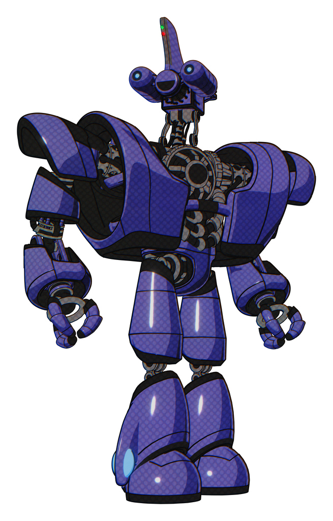 Bot containing dual retro camera head and reversed fin head and heavy upper chest and heavy mech chest and light leg exoshielding. Primary blue halftone. Hero pose.