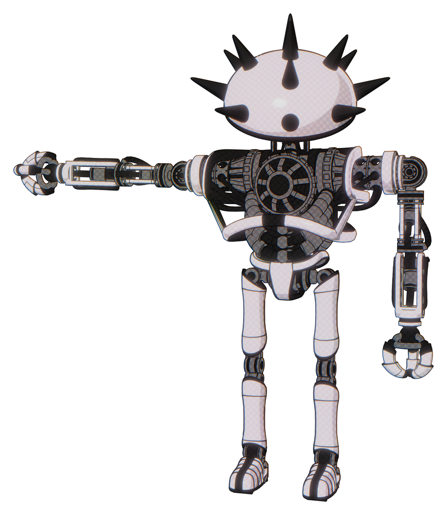 Automaton containing thorny domehead design and heavy upper chest and no chest plating and ultralight foot exosuit. White halftone toon. Arm out holding invisible object..