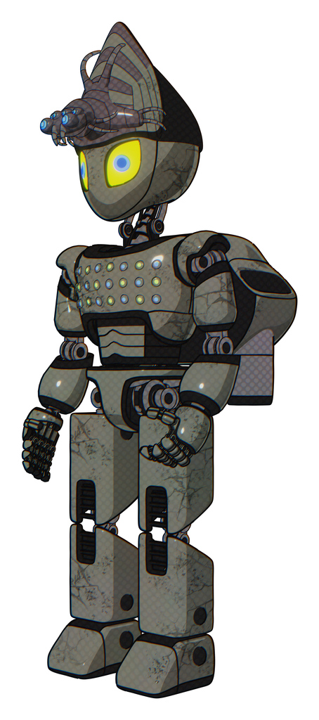 Robot containing grey alien style head and yellow eyes with blue pupils and alien bug creature hat and light chest exoshielding and chest green blue lights array and rocket pack .