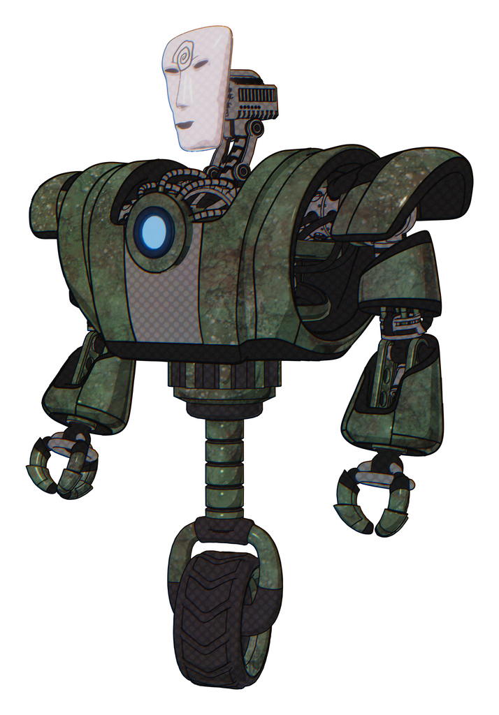 Droid containing humanoid face mask and spiral design and heavy upper chest and heavy mech chest and blue energy fission element chest and unicycle wheel. Old corroded copper.