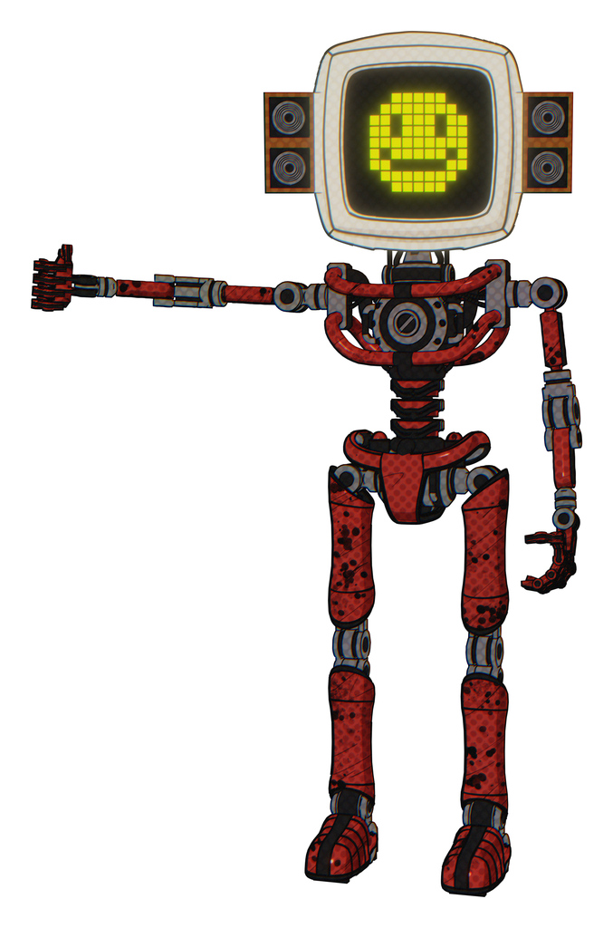 Automaton containing old computer monitor and pixel design of yellow happy face and old retro speakers and light chest exoshielding and no chest plating and ultralight foot exosuit.