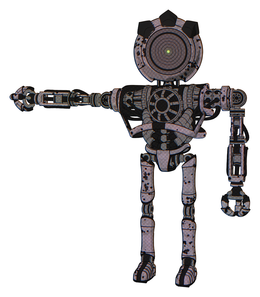 Bot containing green dot eye corn row plastic hair and heavy upper chest and no chest plating and ultralight foot exosuit. Dark ink dots sketch. Arm out holding invisible object..