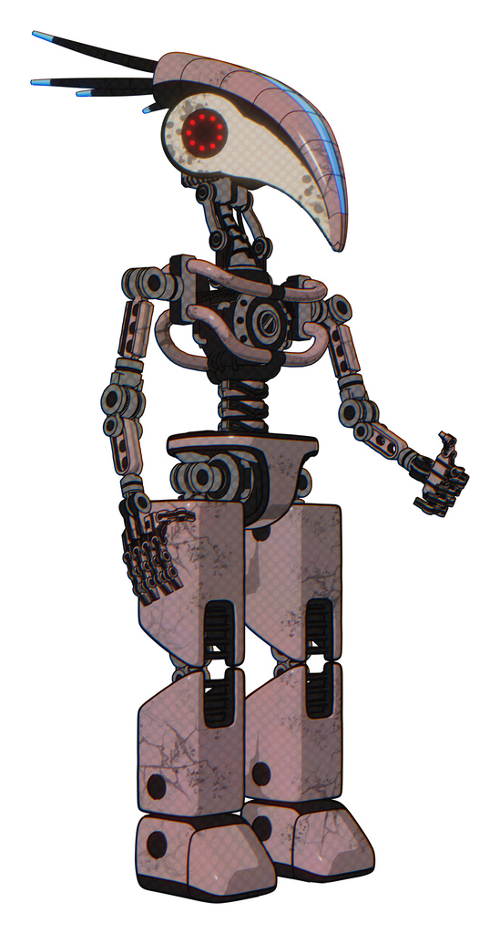 Robot containing bird skull head and red led circle eyes and head shield design and light chest exoshielding and no chest plating and prototype exoplate legs. Powder pink metal. Facing left view.