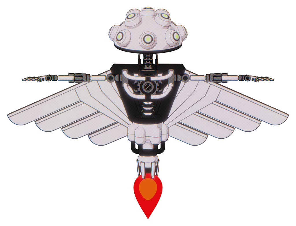 Mech containing techno multi-eyed domehead design and light chest exoshielding and pilot's wings assembly and no chest plating and jet propulsion. White halftone toon. T-pose.