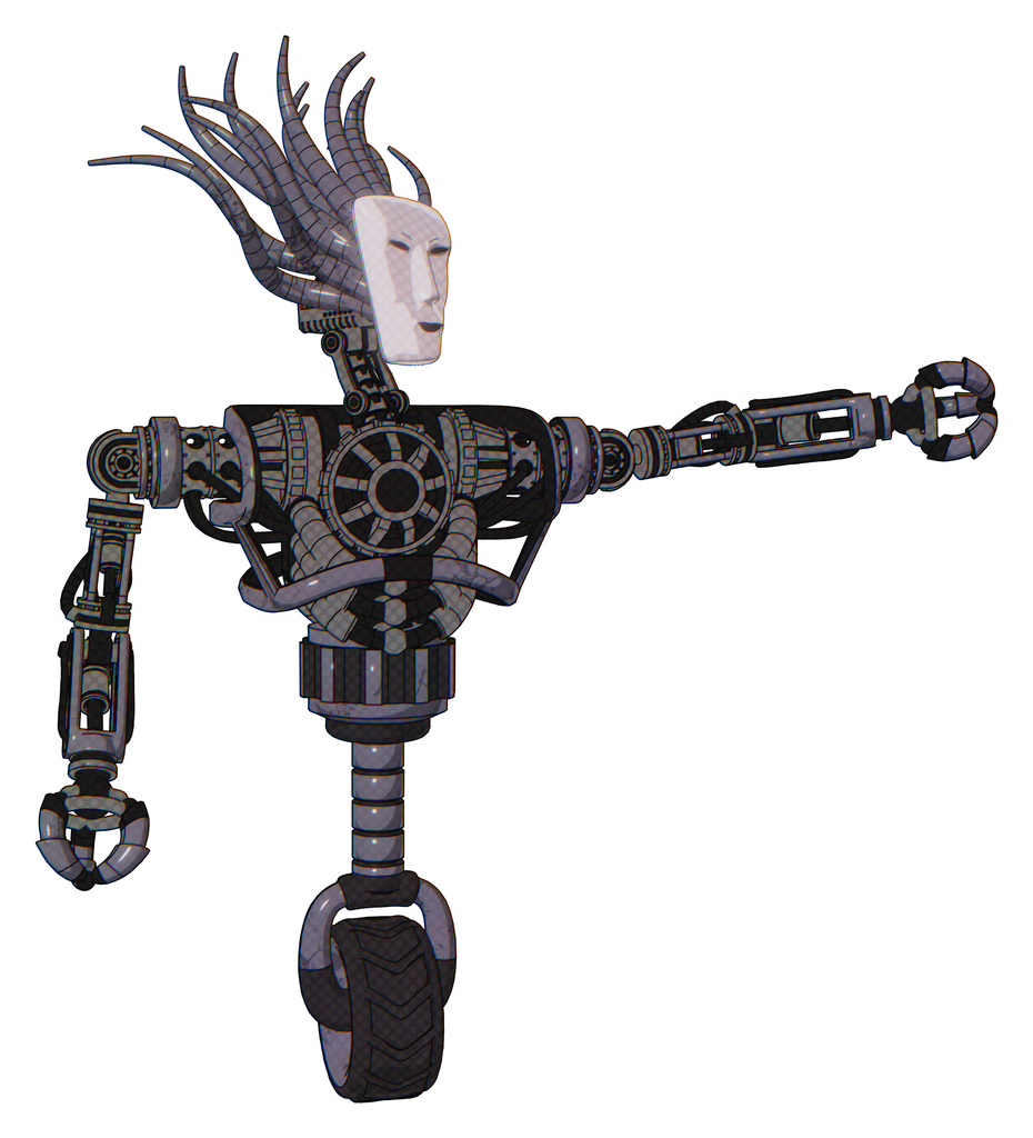 Cyborg containing humanoid face mask and heavy upper chest and no chest plating and unicycle wheel. Light lavender metal. Pointing left or pushing a button..