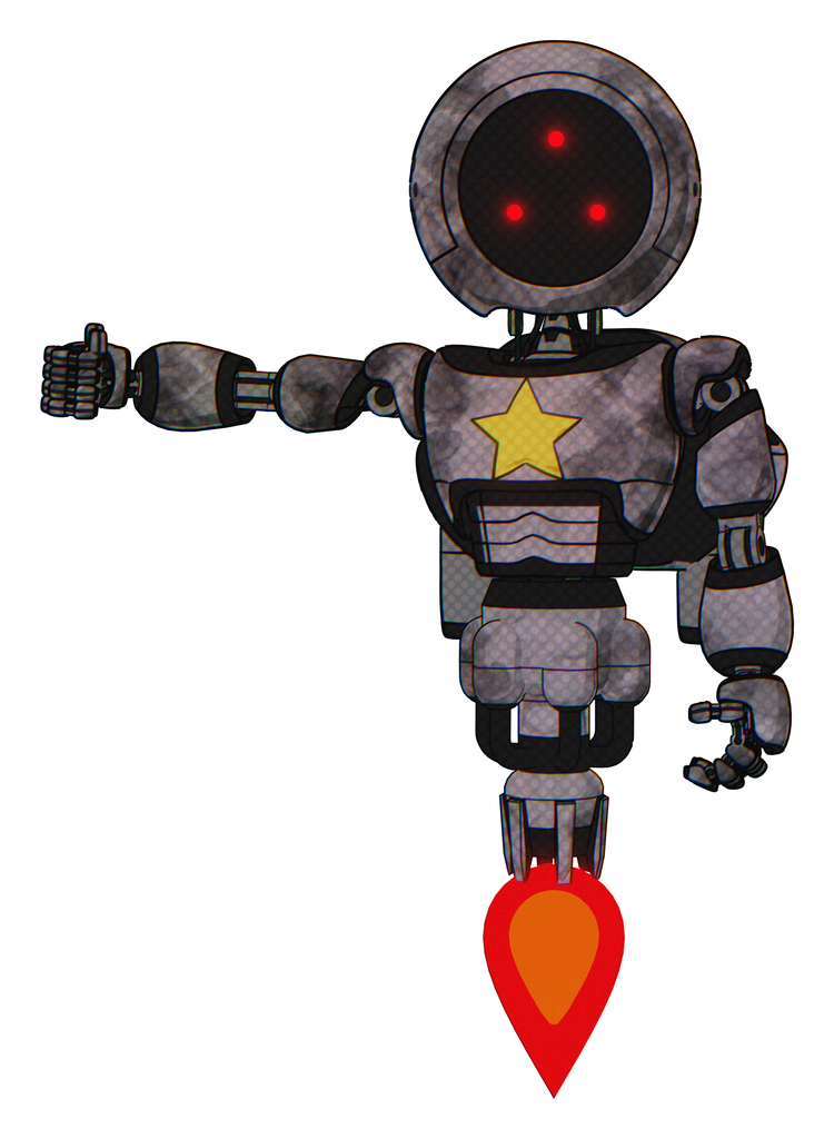 Automaton containing three led eyes round head and light chest exoshielding and yellow star and rocket pack and jet propulsion. Sketch pad cloudy smudges. Arm out holding invisible object..