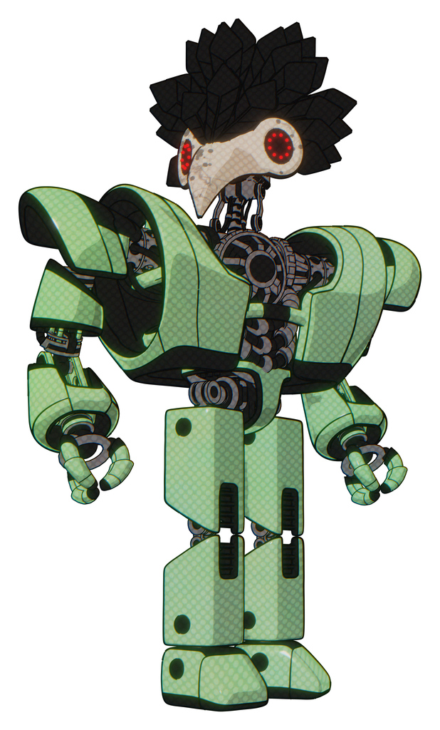 Automaton containing bird skull head and red led circle eyes and crow feather design and heavy upper chest and heavy mech chest and prototype exoplate legs. Green tint toon. Hero pose.
