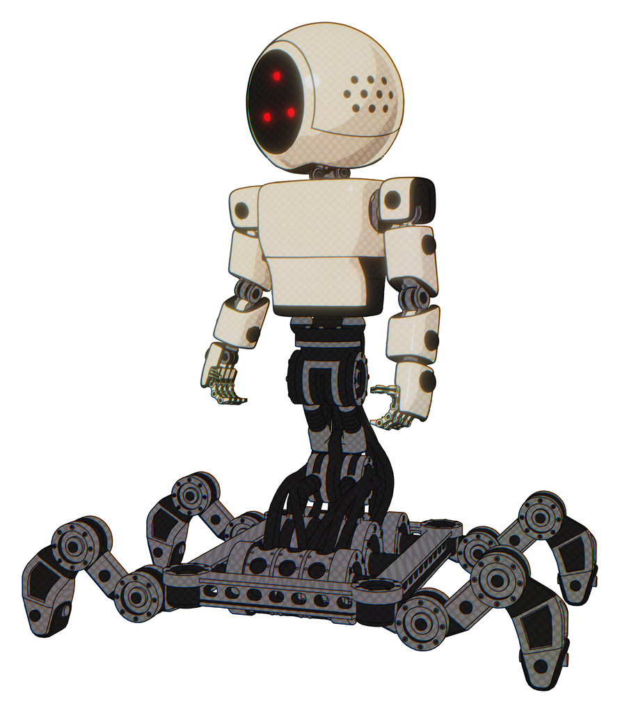 Cyborg containing three led eyes round head and light chest exoshielding and prototype exoplate chest and insect walker legs. Off white toon. Standing looking right restful pose.