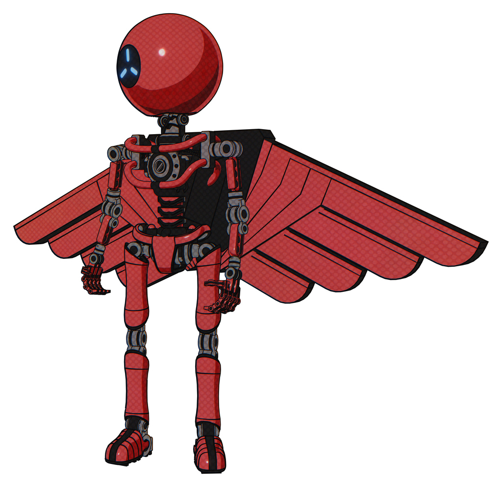 Droid containing dual retro camera head and three-dash cyclops round head and light chest exoshielding and pilot's wings assembly and no chest plating and ultralight foot exosuit.