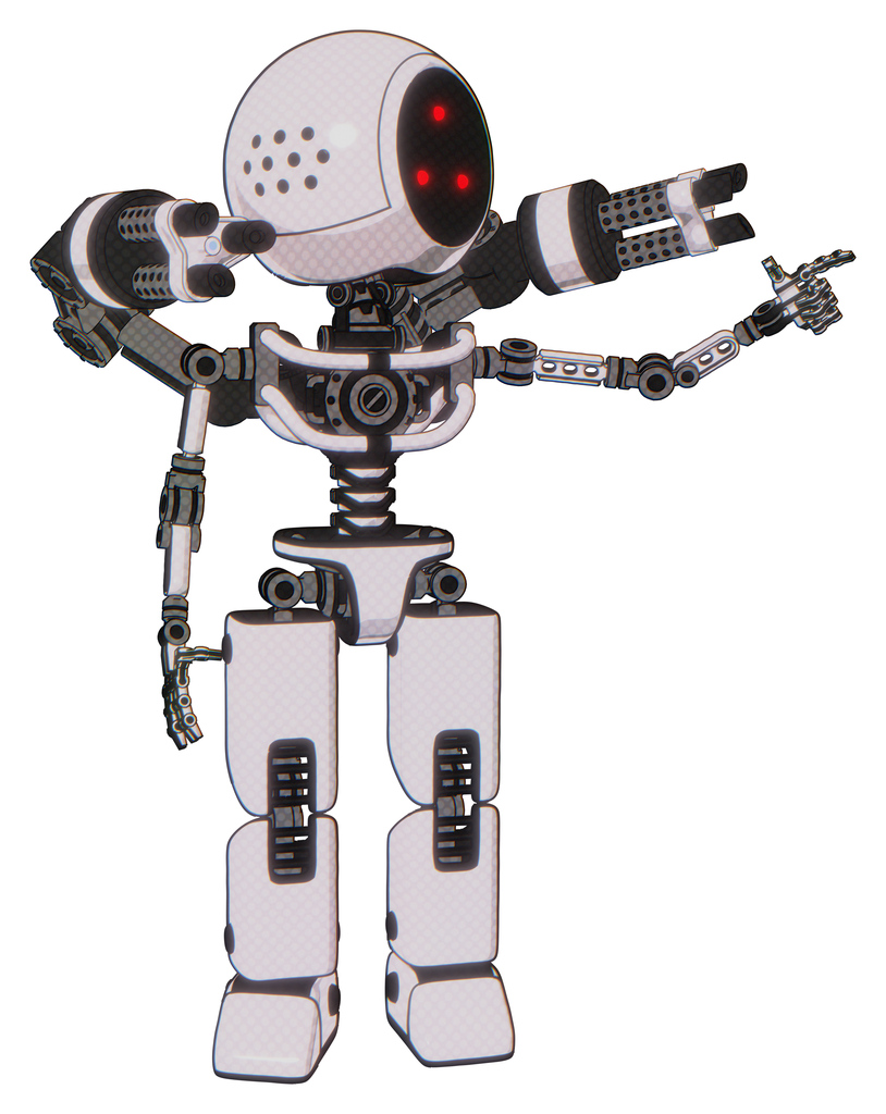 Droid containing three led eyes round head and light chest exoshielding and minigun back assembly and no chest plating and prototype exoplate legs. White halftone toon.