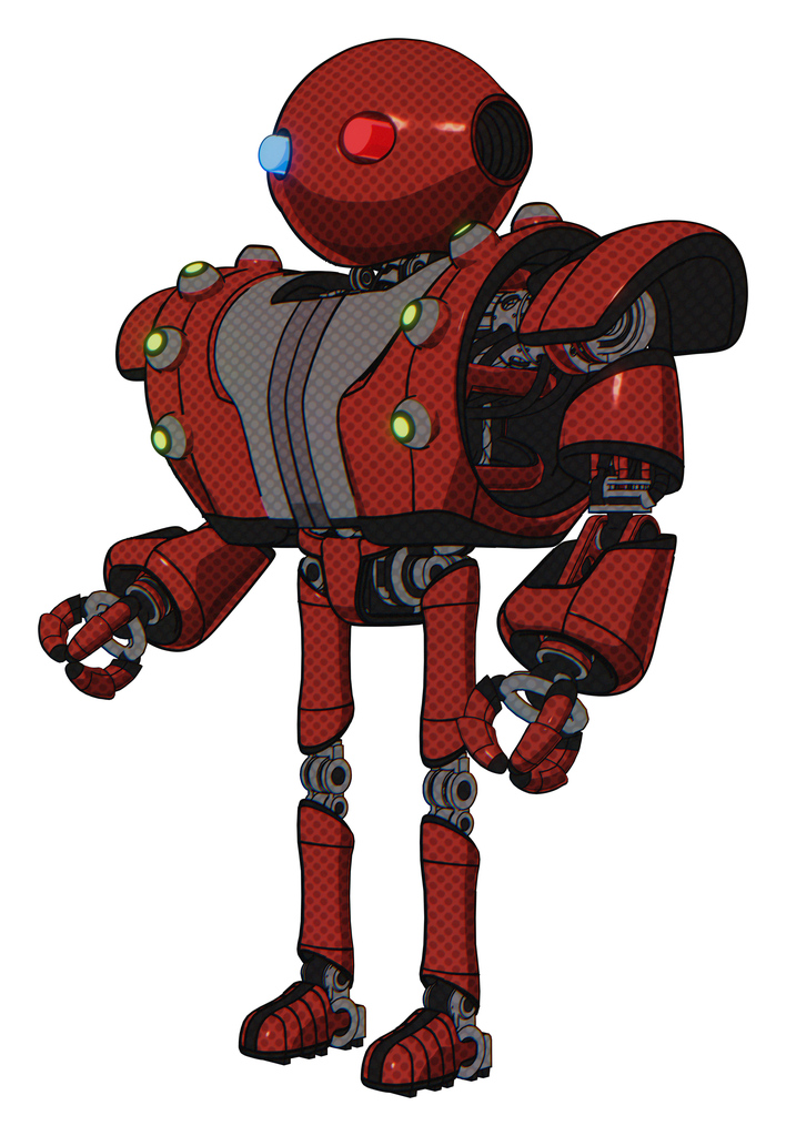 Droid containing oval wide head and giant blue and red led eyes and heavy upper chest and heavy mech chest and green cable sockets array and ultralight foot exosuit. Cherry tomato red.