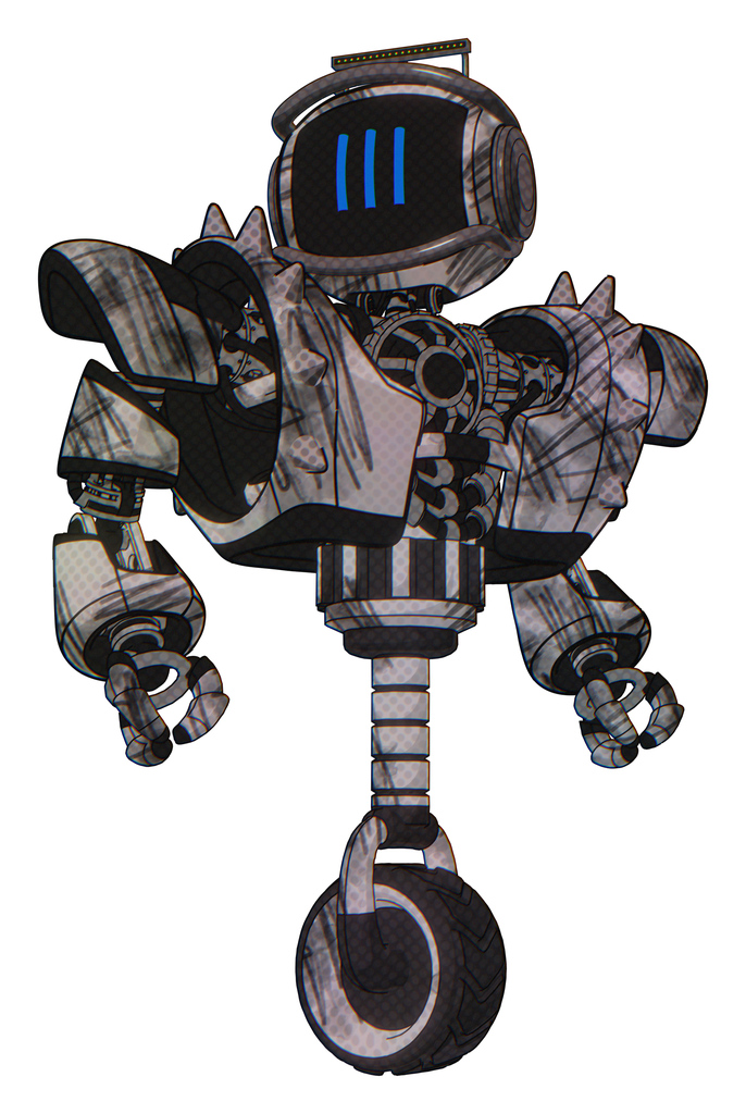 Robot containing digital display head and three vertical line design and led and protection bars and heavy upper chest and heavy mech chest and shoulder spikes and unicycle wheel. Scribble sketch.
