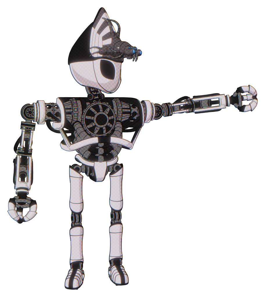 Robot containing grey alien style head and black eyes and alien bug creature hat and heavy upper chest and no chest plating and ultralight foot exosuit. White halftone toon.