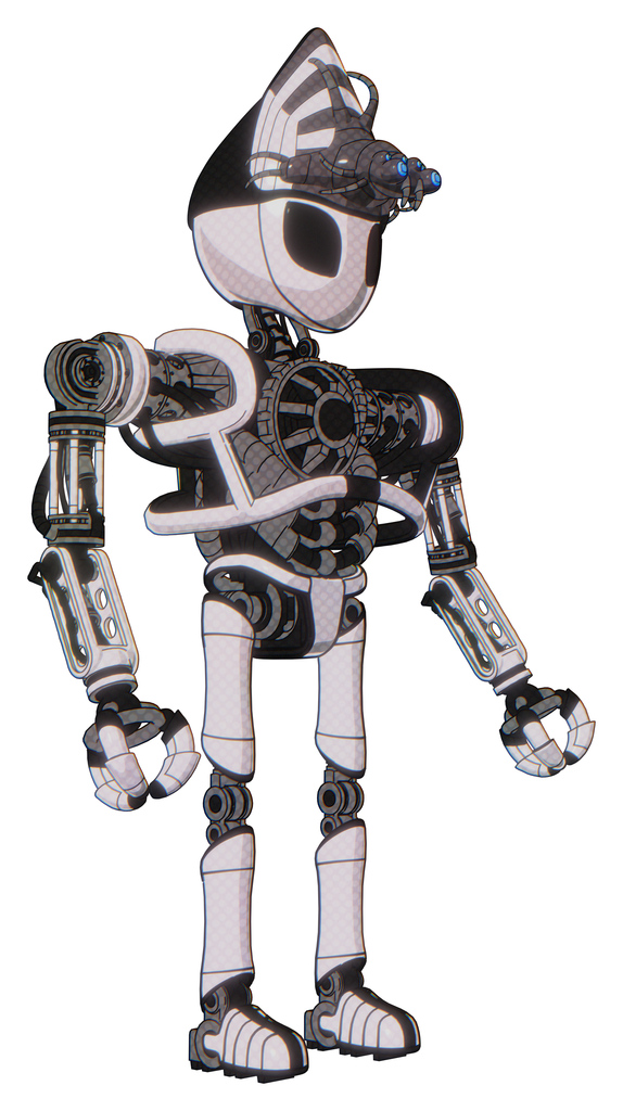 Robot containing grey alien style head and black eyes and alien bug creature hat and heavy upper chest and no chest plating and ultralight foot exosuit. White halftone toon. Facing left view.