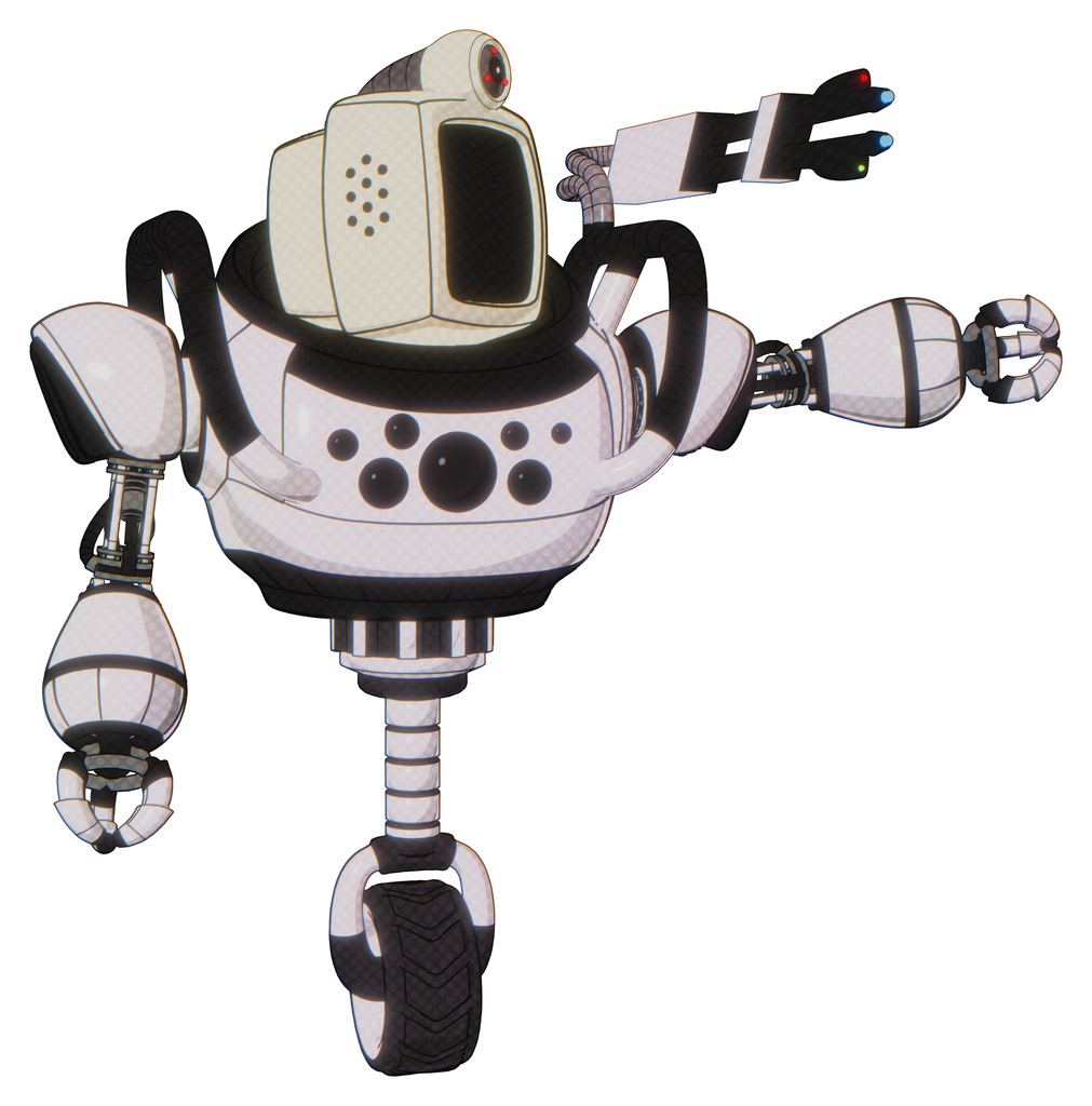 Droid containing old computer monitor and retro-futuristic webcam and heavy upper chest and chest compound eyes and unicycle wheel. White halftone toon. Pointing left or pushing a button..