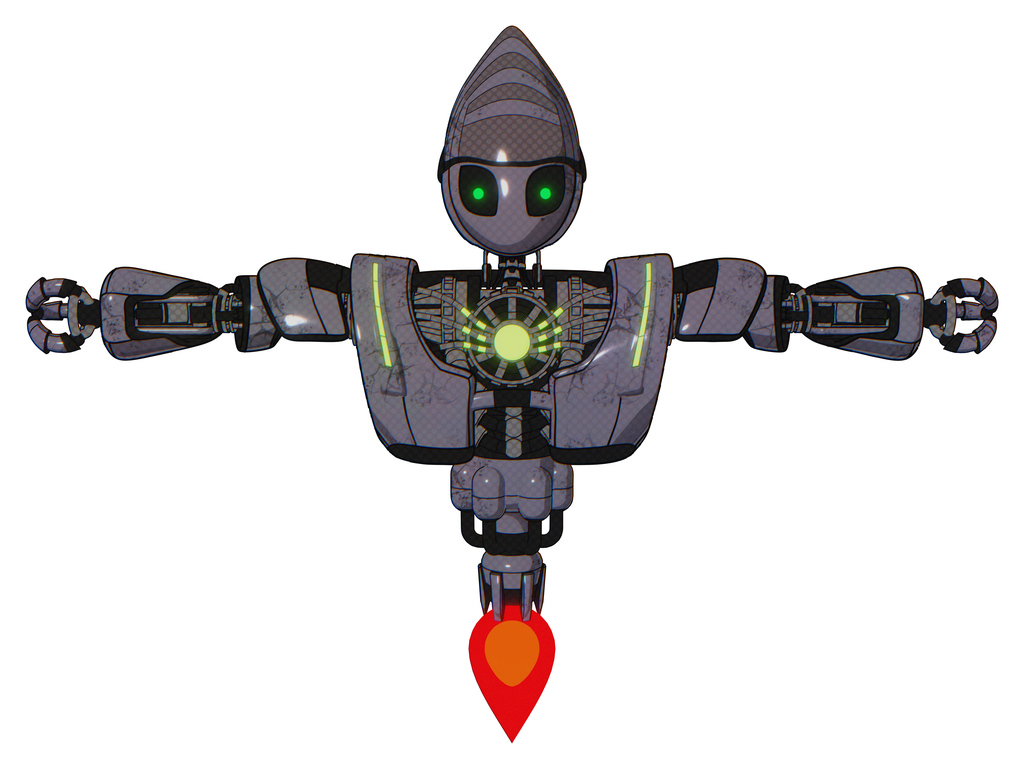 Mech containing grey alien style head and green inset eyes and heavy upper chest and heavy mech chest and green energy core and jet propulsion. Light lavender metal. T-pose.