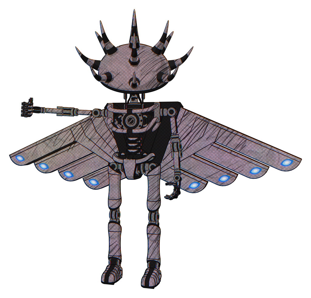Mech containing black and white anemone dome head and light chest exoshielding and cherub wings design and no chest plating and ultralight foot exosuit. Dark sketch lines.