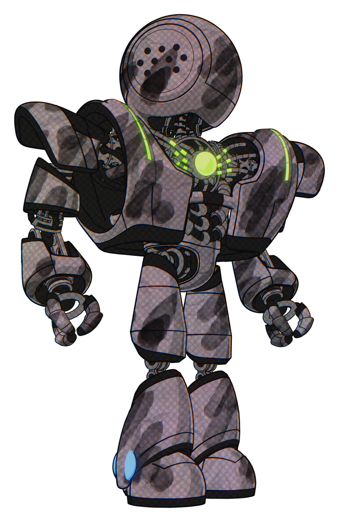 Bot containing dots array face and heavy upper chest and heavy mech chest and green energy core and light leg exoshielding. Sketch pad wet ink smudge. Hero pose.