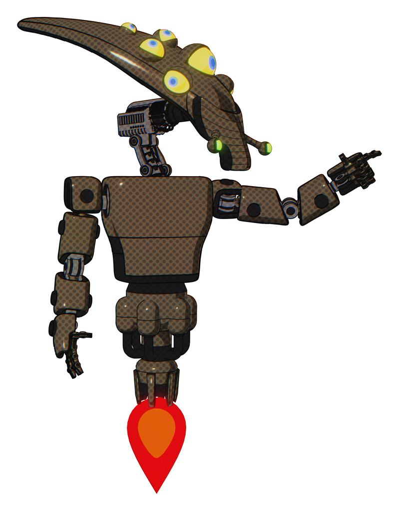Droid containing flat elongated skull head and yellow eyeball array and light chest exoshielding and prototype exoplate chest and jet propulsion. Light brown halftone.