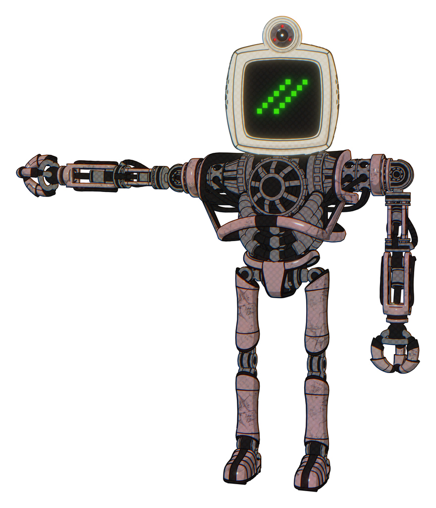 Cyborg containing old computer monitor and double backslash pixel design and retro-futuristic webcam and heavy upper chest and no chest plating and ultralight foot exosuit. Powder pink metal.