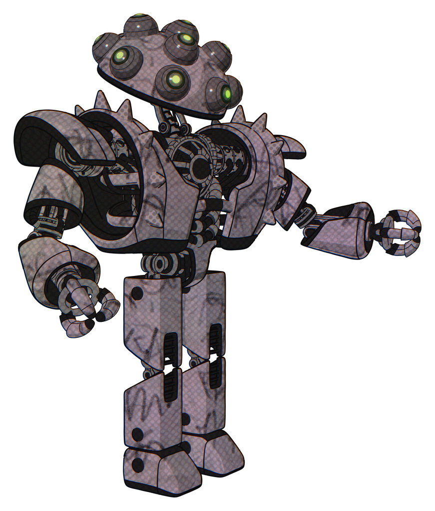 Droid containing many robo-eye domehead design and heavy upper chest and heavy mech chest and shoulder spikes and prototype exoplate legs. Dark sketch random doodle. Interacting.