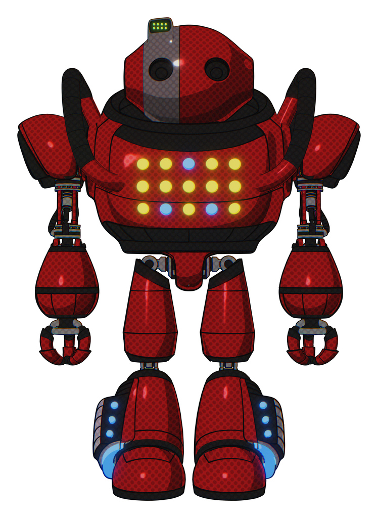 Automaton containing oval wide head and green led ornament and heavy upper chest and colored lights array and light leg exoshielding and megneto-hovers foot mod. Dark red. Front view.