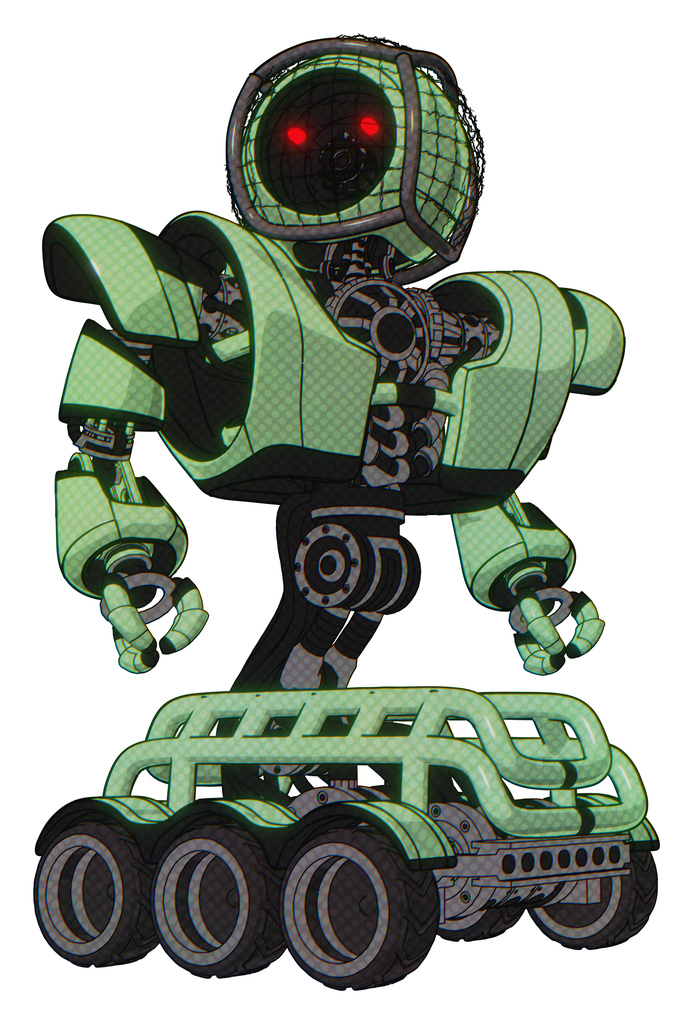 Cyborg containing round barbed wire round head and heavy upper chest and heavy mech chest and six-wheeler base. Green tint toon. Hero pose.