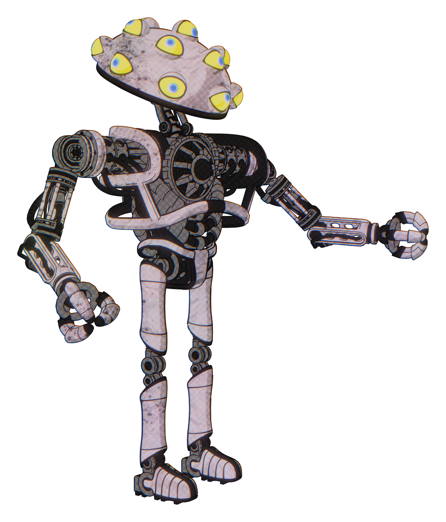Robot containing many-eyed monster head design and heavy upper chest and no chest plating and ultralight foot exosuit. Sketch pad dirty smudge. Interacting.