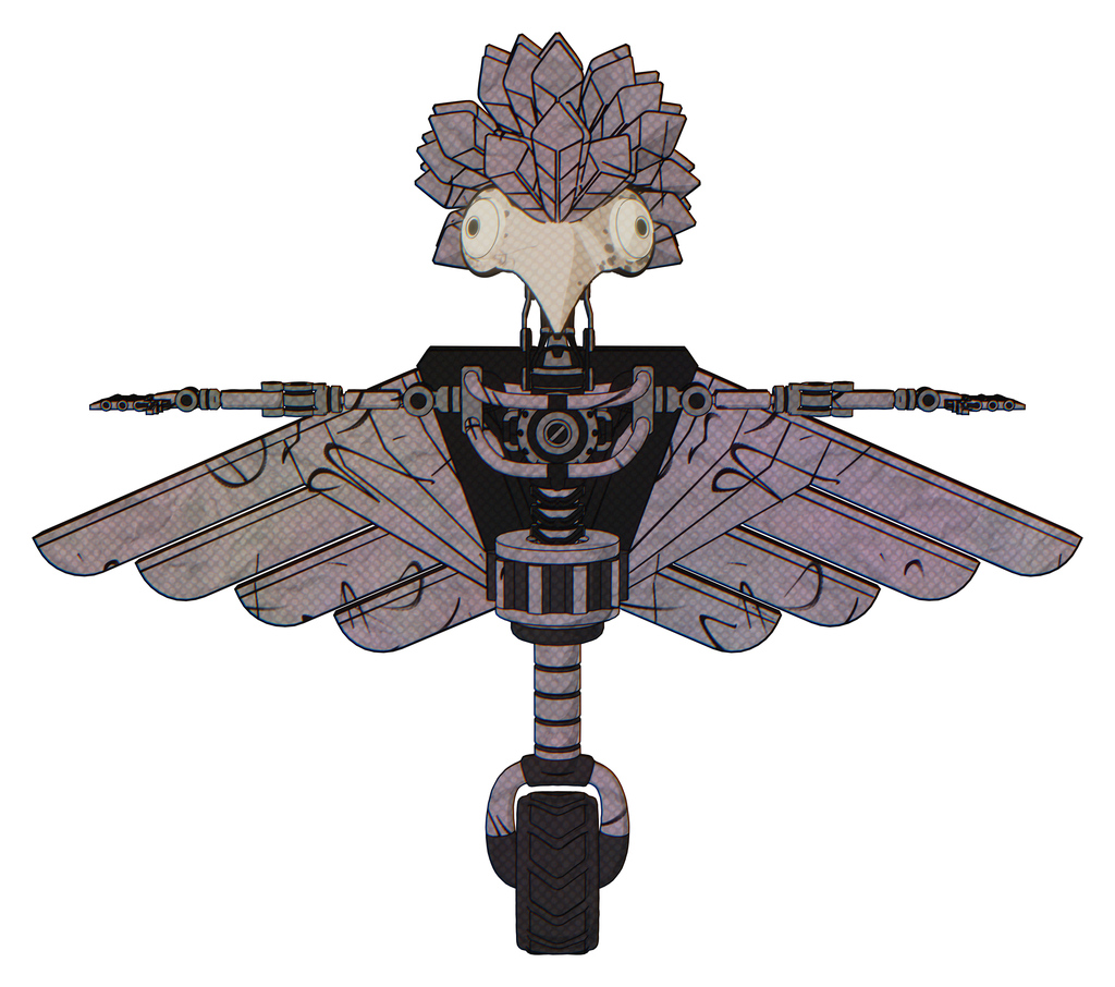 Robot containing bird skull head and bone skull eye holes and bird feather design and light chest exoshielding and pilot's wings assembly and no chest plating and unicycle wheel. Dark sketch doodle.