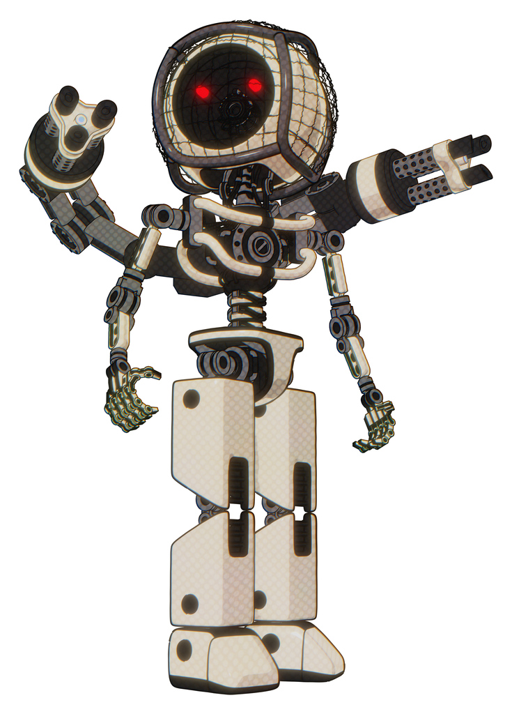 Robot containing round barbed wire round head and light chest exoshielding and minigun back assembly and no chest plating and prototype exoplate legs. Off white toon. Hero pose.