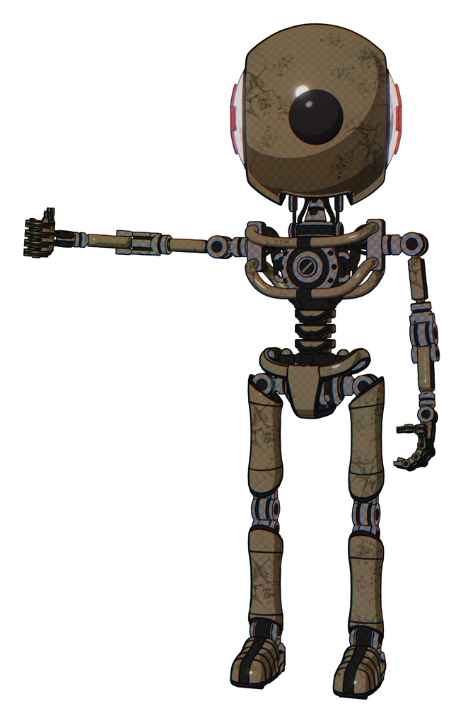 Cyborg containing round head and large cyclops eye and first aid emblem and light chest exoshielding and no chest plating and ultralight foot exosuit. Desert tan painted.