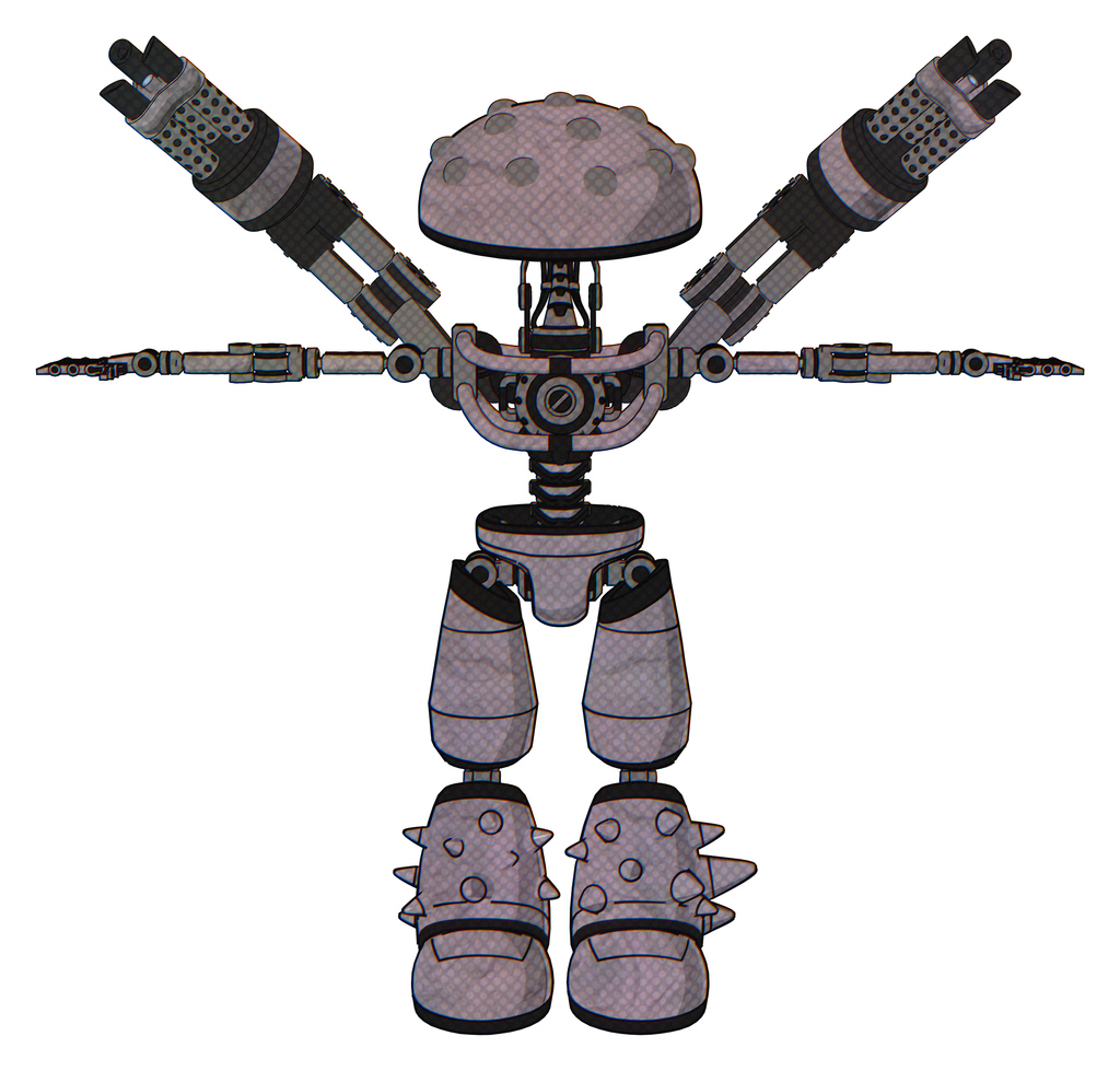 Bot containing metal knucklehead design and light chest exoshielding and minigun back assembly and no chest plating and light leg exoshielding and spike foot mod. Dark sketch. T-pose.
