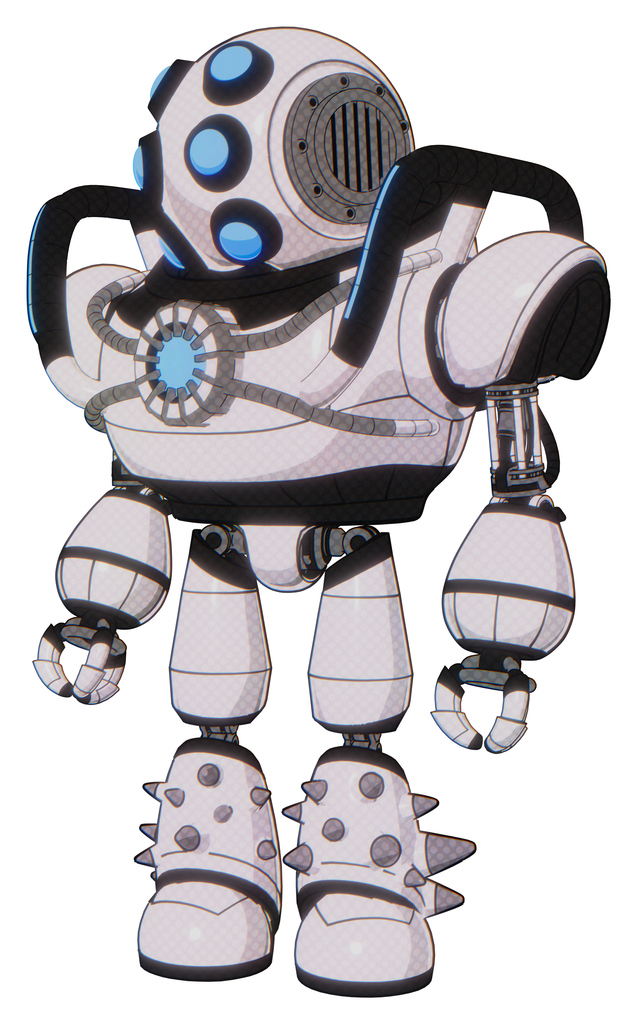 Automaton containing elements: round head, six eye array, bug eyes, heavy upper chest, chest blue energy core, blue strip lights, light leg exoshielding, spike foot mod. Material: White halftone toon.